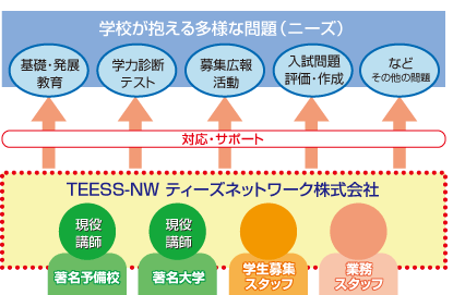 著名予備校や塾・高校・大学などで活躍する現役の講師との信頼関係に基づき、各講師が教育現場で蓄積した「学習指導ノウハウ」、「入試問題などへの客観評価」等の能力を、それぞれの指導現場の枠を超えて広く活躍できる場を提供することにより、大学・高校での基礎・発展教育、入試・募集広報活動などにおける多様なニーズにお応えし、業務の一端をサポートさせていただくことを目的として、元予備校職員がネットワーク起点会社として2006年6月に設立いたしました。